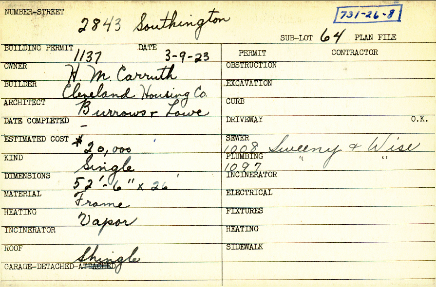 2843 Southington Road Shaker Heights, OH 44120 PARCEL ID: 731-26-008 Building Permit Date: 03-09-1923 Plan File Number: 3228, 3836, 8016 Microfilm Roll: Roll#47, Roll#56, Roll#97 Neighborhood: Boulevard Owner: Carruth, H. M. Builder: Cleveland Housing Company Architect: Burrows and Lowe Estimated Cost: 20000 Kind: Single, Single Residence or Dwelling Material: Frame Heating: Vapor Roof: Shingles Garage: detached |