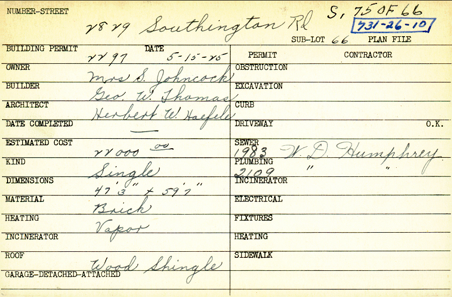 2829 Southington Road Shaker Heights, OH 44120 PARCEL ID: 731-26-010 Building Permit Date: 05-15-1925 Plan File Number: 0 Neighborhood: Boulevard Owner: Johncock, Mrs. S. Builder: Thomas, George W. Architect: Haefele, Herbert W. Estimated Cost: 22000 Kind: Single, Single Residence or Dwelling Material: Brick Heating: Vapor Roof: Wood Shingle Card Available: yes |