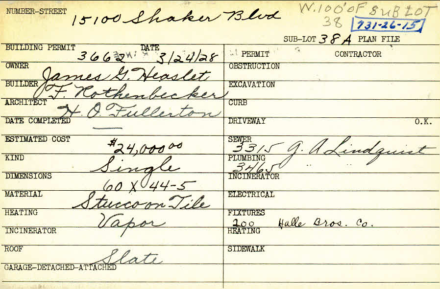 15100 Shaker Boulevard Shaker Heights, OH 44120 PARCEL ID: 731-26-015 Building Permit Date: 03-24-1928 Plan File Number: 5460 Microfilm Roll: Roll#74 Neighborhood: Boulevard Owner: Heaslet, James G. Builder: Rothenbecker, F. Architect: Fullerton, H. O. Estimated Cost: 24000 Kind: Single, Single Residence or Dwelling Material: Stucco on Tile Heating: Vapor Roof: Slate |