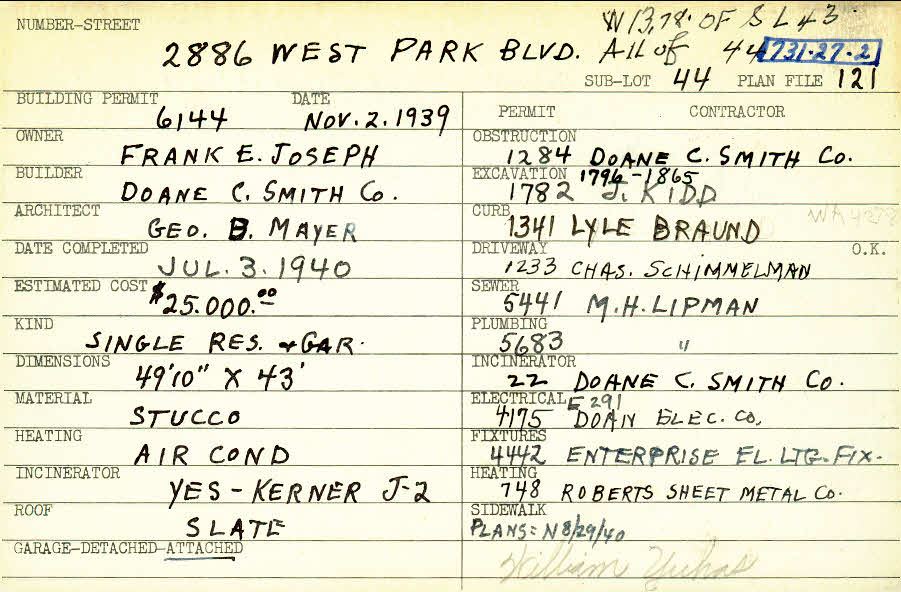 2886 West Park Boulevard Shaker Heights, OH 44120 PARCEL ID: 731-27-002 Building Permit Date: 11-02-1939 Plan File Number: 121, 3633 Microfilm Roll: Roll#54 Neighborhood: Boulevard Owner: Joseph, Frank E. Builder: Doane C. Smith Company Architect: Mayer, George B. Estimated Cost: 25000 Date Completed: 07-03-1940 Kind: Single Dwelling and Garage Material: Stucco Heating: Air Conditioned Roof: Slate Garage: attached |
