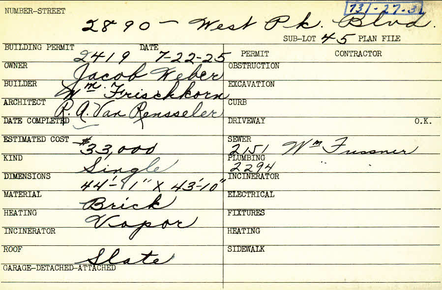 2890 West Park Boulevard Shaker Heights, OH 44120 PARCEL ID: 731-27-003 Building Permit Date: 07-22-1925 Owner: Weber, Jacob Builder: Frischkorn, William Architect: Van Rensselaer, Richard Abram Estimated Cost: 33000 Kind: Single, Single Residence or Dwelling Material: Brick Heating: Vapor Roof: Slate Blueprints: no blueprints on microfilm |
