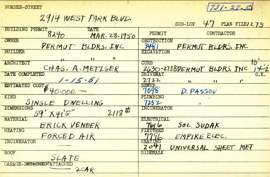2914 West Park Boulevard Shaker Heights, OH 44120 PARCEL ID: 731-27-005 Building Permit Date: 03-28-1950 Plan File Number: 1275 all scanned Microfilm Roll: Roll015 Neighborhood: Boulevard Owner: Permut Builders Inc. Builder: Permut Builders Inc. Architect: Metzger, Charles A. Estimated Cost: 40000 Date Completed: 01-15-1951 Kind: Single, Single Residence or Dwelling Material: Brick Veneer Heating: Forced Air Roof: Slate Garage: attached 2 car |