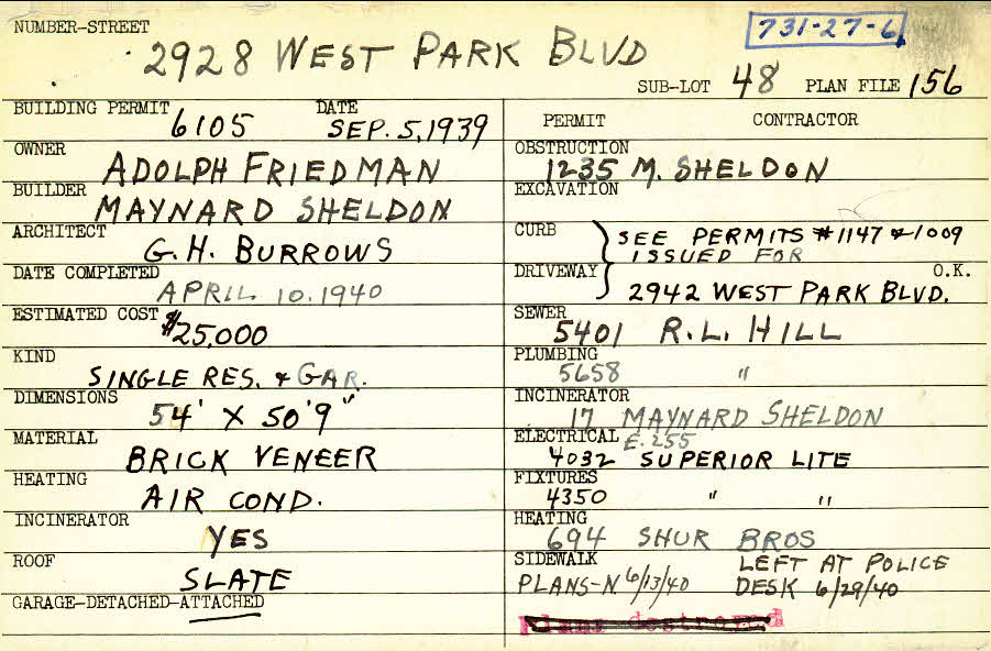 2928 West Park Boulevard Shaker Heights, OH 44120 PARCEL ID: 731-27-006 Building Permit Date: 09-05-1939 Neighborhood: Boulevard Owner: Friedman, Adolph Builder: Sheldon, Maynard Architect: Burrows, G. H. Estimated Cost: 25000 Date Completed: 04-10-1940 Kind: Single Dwelling and Garage Material: Brick Veneer Heating: Air Conditioned Roof: Slate Garage: attached Blueprints: no blueprints on microfilm |