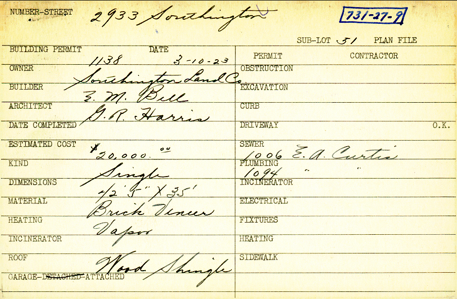 2933 Southington Road Shaker Heights, OH 44120 PARCEL ID: 731-27-009 Building Permit Date: 03-10-1923 Plan File Number: 0 Neighborhood: Boulevard Owner: Southington Land Company Builder: Bell, E. M. Architect: Harris, George R. Estimated Cost: 20000 Kind: Single, Single Residence or Dwelling Material: Brick Veneer Heating: Vapor Roof: Wood Shingle Garage: attached |