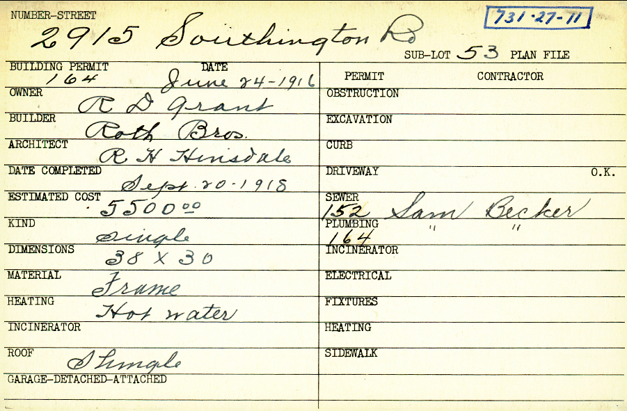 2915 Southington Road Shaker Heights, OH 44120 PARCEL ID: 731-27-011 Building Permit Date: 06-24-1916 Plan File Number: 0 Owner: Grant, R. D. Builder: Roth Brothers Architect: Hinsdale, Reynold H. Estimated Cost: 5500 Date Completed: 09-20-1918 Kind: Single, Single Residence or Dwelling Material: Frame Heating: Hot Water Roof: Shingles |