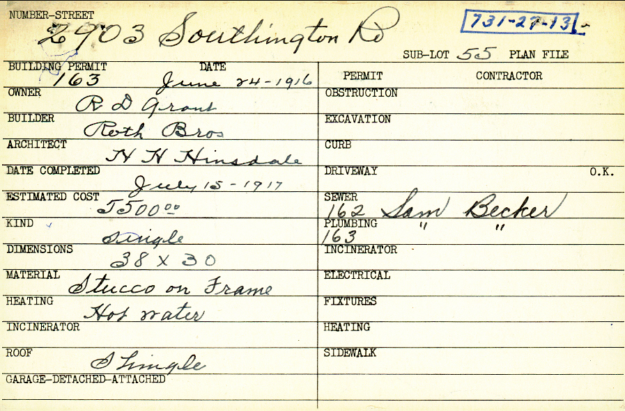 2903 Southington Road Shaker Heights, OH 44120 PARCEL ID: 731-27-013 Building Permit Date: 06-24-1916 Plan File Number: 10334, 10832, 11967 Microfilm Roll: NewRoll#3, NewRoll#6, NewRoll#10 Owner: Grant, R. D. Builder: Roth Brothers Architect: Hinsdale, Reynold H. Estimated Cost: 5500 Date Completed: 07-15-1917 Kind: Single, Single Residence or Dwelling Material: Stucco on Frame Heating: Hot Water Roof: Shingles |