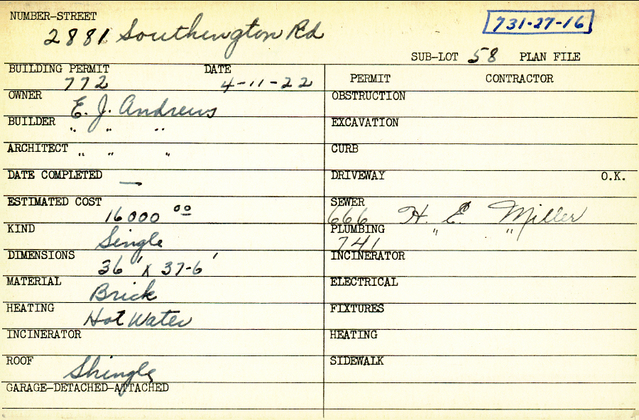 2881 Southington Road Shaker Heights, OH 44120 PARCEL ID: 731-27-016 Building Permit Date: 04-11-1922 Plan File Number: 0 Neighborhood: Boulevard Owner: Andrews, E. J. Builder: Andrews, E. J. Architect: Andrews, E. J. Estimated Cost: 16000 Kind: Single, Single Residence or Dwelling Material: Brick Heating: Hot Water Roof: Shingles Card Available: yes |