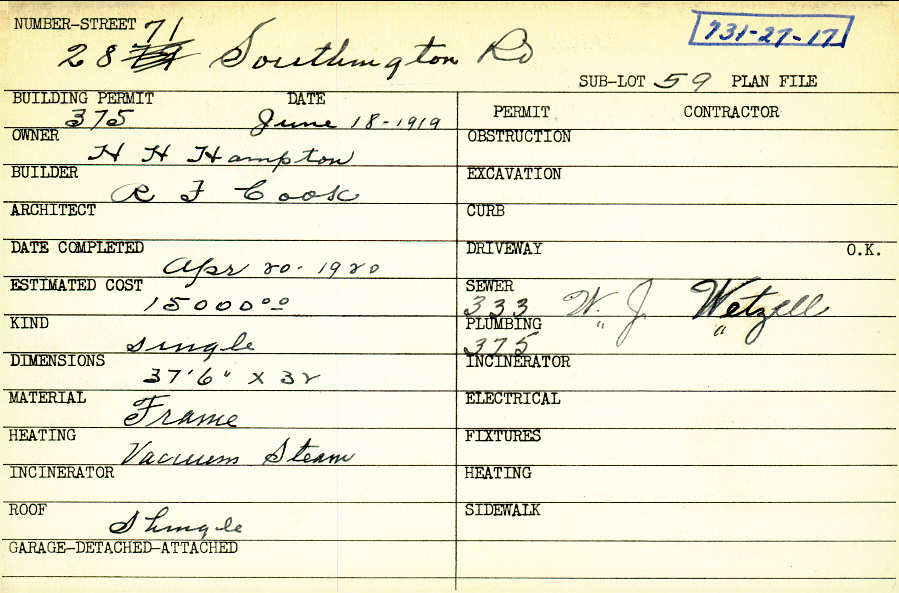 2871 Southington Road Shaker Heights, OH 44120 PARCEL ID: 731-27-017 Building Permit Date: 06-18-1919 Plan File Number: 600 all scanned Microfilm Roll: Roll007 Owner: Hampton, H. H. Builder: Cook, R. F. Estimated Cost: 15000 Date Completed: 04-20-1920 Kind: Single, Single Residence or Dwelling Material: Frame Heating: Steam Roof: Shingles |