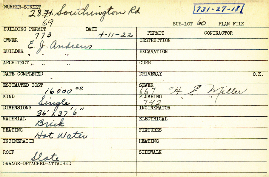 2869 Southington Road Shaker Heights, OH 44120 PARCEL ID: 731-27-018 Building Permit Date: 04-11-1922 Plan File Number: 0 Neighborhood: Boulevard Owner: Andrews, E. J. Builder: Andrews, E. J. Architect: Andrews, E. J. Estimated Cost: 16000 Kind: Single, Single Residence or Dwelling Material: Brick Heating: Hot Water Roof: Slate Card Available: yes |