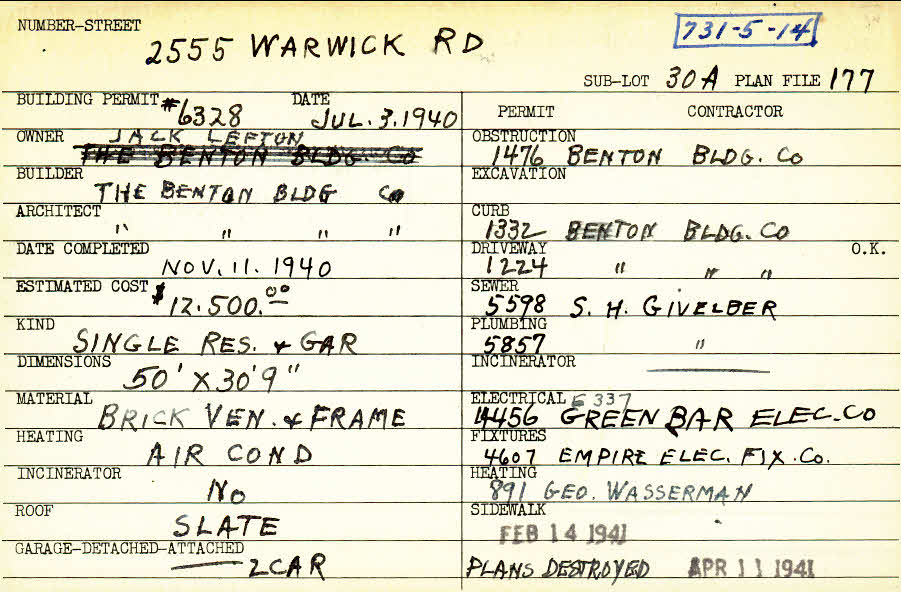 2555 Warwick Road Shaker Heights, OH 44120 PARCEL ID: 731-05-014 Building Permit Date: 07-03-1940 Plan File Number: 1525 scanned Microfilm Roll: Roll024 Owner: Lefton, Jack Builder: The Benton Building Company Architect: The Benton Building Company Estimated Cost: 12500 Date Completed: 11-11-1940 Kind: Single Dwelling and Garage Material: Brick Veneer and Frame Heating: Air Conditioned Roof: Slate Garage: attached 2 car |