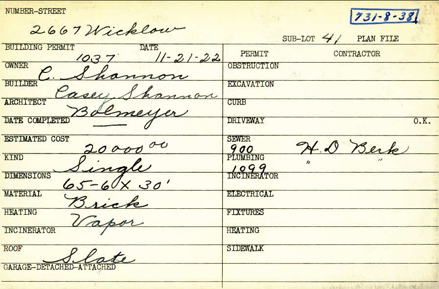 2667 Wicklow Road Shaker Heights, OH 44120 PARCEL ID: 731-08-038 Building Permit Date: 11-21-1922 Plan File Number: 0 Neighborhood: Boulevard Owner: Shannon, C. Builder: Shannon, Casey Architect: Bolmeyer Estimated Cost: 20000 Kind: Single, Single Residence or Dwelling Material: Brick Heating: Vapor Roof: Slate |