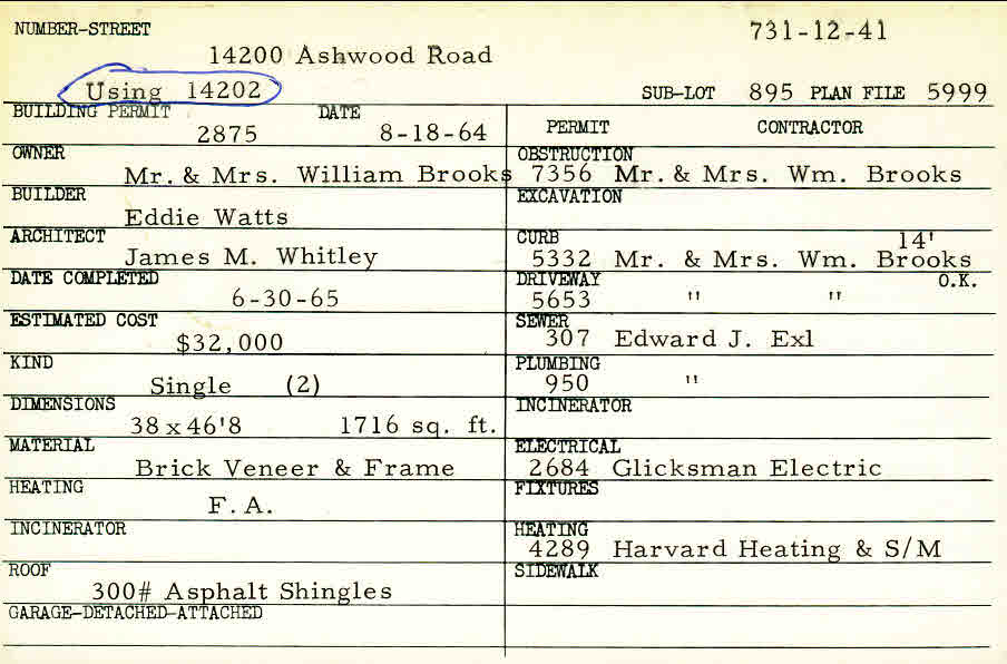 14202 Ashwood Road Shaker Heights, OH 44120 PARCEL ID: 731-12-041 Building Permit Date: 08-18-1964 Plan File Number: 5999 Neighborhood: Ludlow Owner: Brooks, Mr. and Mrs. William Builder: Watts, Eddie Architect: Whitley, James M. Estimated Cost: 32000 Date Completed: 06-30-1965 Kind: Single, Single Residence or Dwelling (2) Material: Brick veneer and frame Heating: Forced Air Roof: 300# Min Asphalt Card Available: yes |