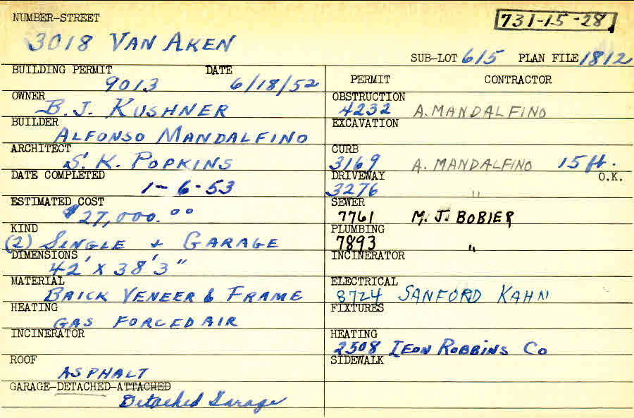3018 Van Aken Boulevard Shaker Heights, OH 44120 PARCEL ID: 731-15-028 Building Permit Date: 06-18-1952 Plan File Number: 1812 all scanned Microfilm Roll: Roll027 Neighborhood: Ludlow Owner: Kushner, B. J. Builder: Mandalfino, Alfonso Architect: Popkins, S. K. Estimated Cost: 27000 Date Completed: 01-06-1953 Kind: Single Dwelling and Garage (2) Material: Brick Veneer and Frame Heating: Forced Air - Gas Roof: Asphalt Garage: detached |
