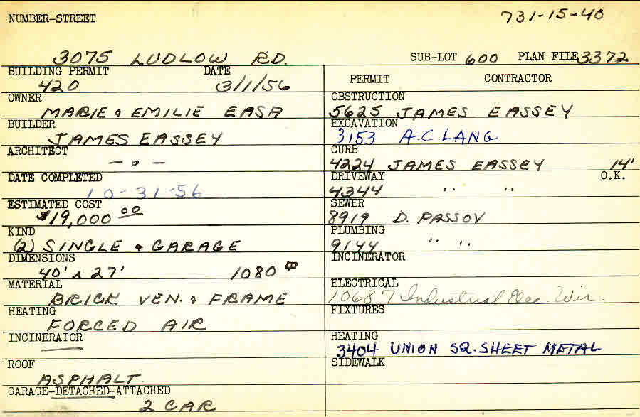 3075 Ludlow Road Shaker Heights, OH 44120 PARCEL ID: 731-15-040 Building Permit Date: 03-01-1956 Plan File Number: 3372 all scanned Microfilm Roll: Roll049 Neighborhood: Ludlow Owner: Easa, Marie and Emilie Builder: Eassey, James Estimated Cost: 19000 Date Completed: 10-31-1956 Kind: Single Dwelling and Garage (2) Material: Brick Veneer and Frame Heating: Forced Air Roof: Asphalt Garage: detached 2 car |