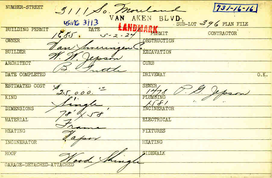 3113 Van Aken Boulevard Shaker Heights, OH 44120 PARCEL ID: 731-16-016 Building Permit Date: 05-02-1924 Plan File Number: 6106 all scanned Microfilm Roll: Roll083 Neighborhood: Onaway Owner: Van Sweringen Company Builder: Jepson, W. W. Architect: Tuttle, Bloodgood Estimated Cost: 25000 Kind: Single, Single Residence or Dwelling Material: Frame Heating: Vapor Roof: Wood Shingle Blueprints: online, see link above |