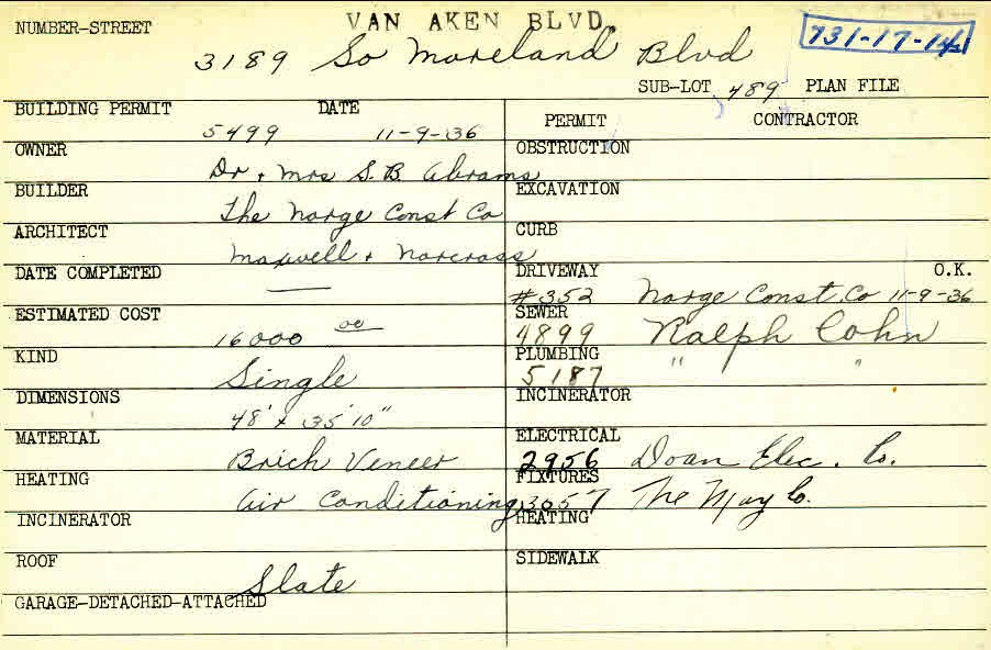3189 Van Aken Boulevard Shaker Heights, OH 44120 PARCEL ID: 731-17-014 Building Permit Date: 11-09-1936 Plan File Number: 0 Neighborhood: Onaway Owner: Abrams, Dr. and Mrs. S. B. Builder: The Norge Construction Company Architect: Maxwell and Norcross Estimated Cost: 16000 Kind: Single, Single Residence or Dwelling Material: Brick Veneer Heating: Air Conditioned Roof: Slate |