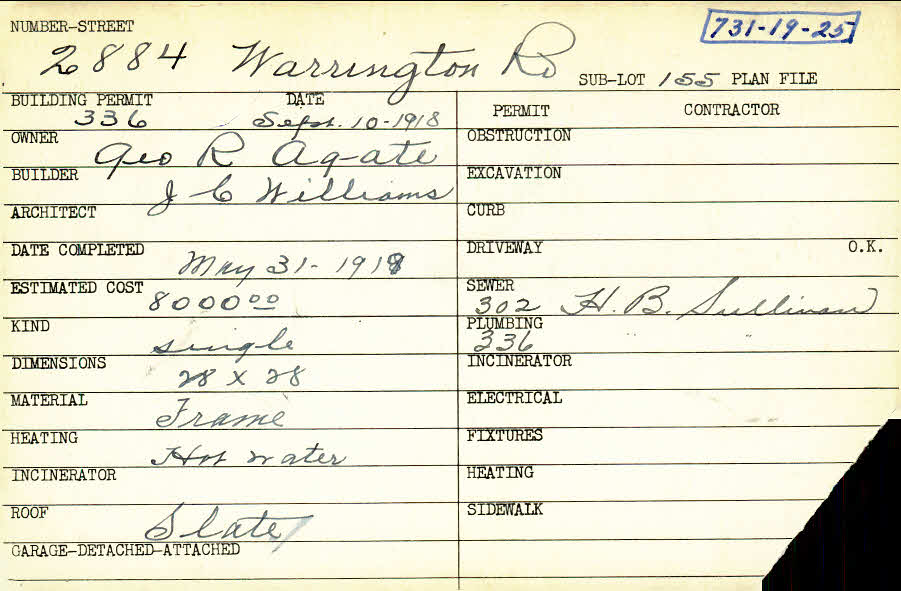 2884 Warrington Road Shaker Heights, OH 44120 PARCEL ID: 731-19-025 Building Permit Date: 09-10-1918 Plan File Number: 0 Neighborhood: Boulevard Owner: Agate, George R. Builder: Williams, J. C. Estimated Cost: 8000 Date Completed: 05-31-1919 Kind: Single, Single Residence or Dwelling Material: Frame Heating: Hot Water Roof: Slate |