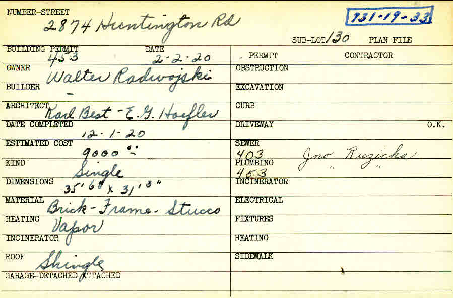 2874 Huntington Road Shaker Heights, OH 44120 PARCEL ID: 731-19-033 Building Permit Date: 02-02-1920 Plan File Number: 4758 Microfilm Roll: Roll#66 Neighborhood: Boulevard Owner: Radwojski, Walter Architect: Best and Hoefler Estimated Cost: 9000 Date Completed: 12-01-1920 Kind: Single, Single Residence or Dwelling Material: Brick, Frame, Stucco Heating: Vapor Roof: Shingles |