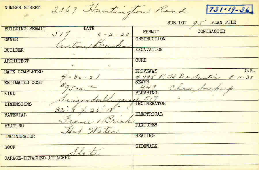 2869 Huntington Road Shaker Heights, OH 44120 PARCEL ID: 731-19-036 Building Permit Date: 06-02-1920 Plan File Number: 0 Neighborhood: Boulevard Owner: Brewka, Anton Builder: Brewka, Anton Architect: Brewka, Anton Estimated Cost: 9500 Date Completed: 04-30-1921 Kind: Single Dwelling and Garage Material: Frame and Brick Heating: Hot Water Roof: Slate |