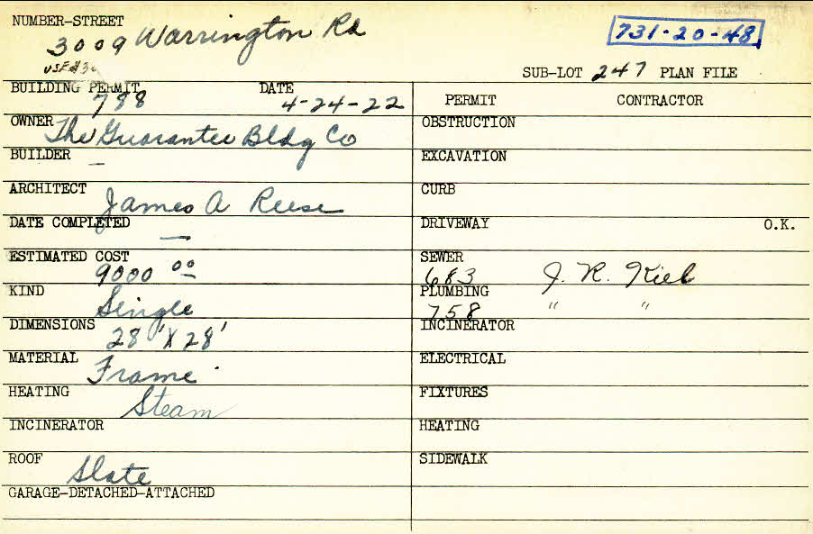 3009 Warrington Road Shaker Heights, OH 44120 PARCEL ID: 731-20-048 Building Permit Date: 04-24-1922 Plan File Number: 0 Neighborhood: Onaway Owner: The Guarantee Building Company Architect: Reese, James A. Estimated Cost: 9000 Kind: Single, Single Residence or Dwelling Material: Frame Heating: Steam Roof: Slate |
