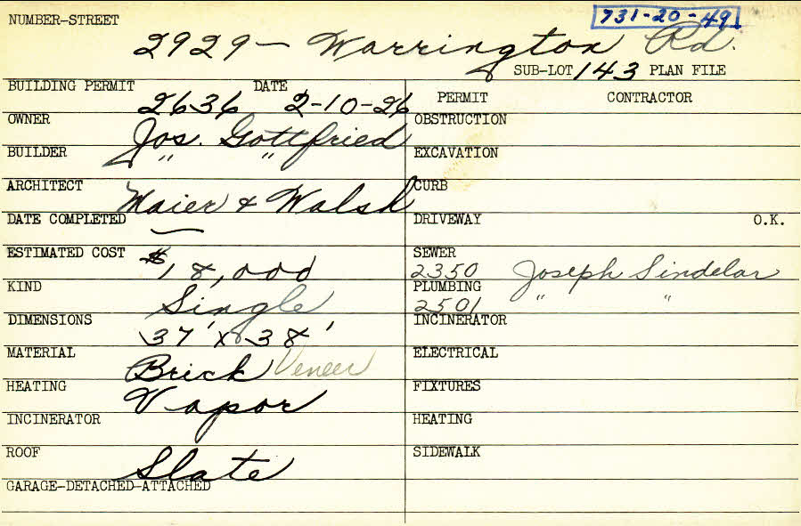 2929 Warrington Road Shaker Heights, OH 44120 PARCEL ID: 731-20-049 Building Permit Date: 02-10-1926 Plan File Number: 10772 Microfilm Roll: NewRoll#5 Neighborhood: Boulevard Owner: Gottfried, Joseph Builder: Gottfried, Joseph Architect: Maier and Walsh Estimated Cost: 18000 Kind: Single, Single Residence or Dwelling Material: Brick Veneer Heating: Vapor Roof: Slate |