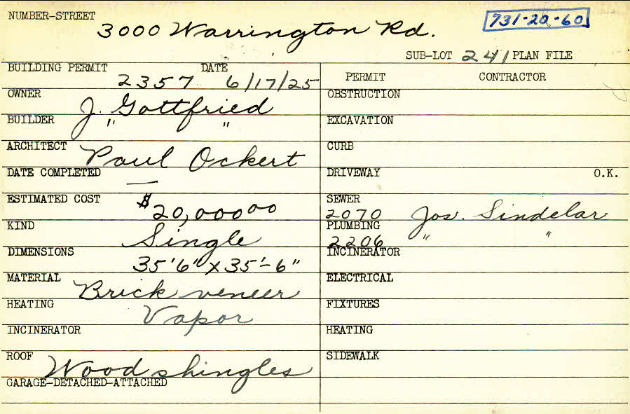 3000 Warrington Road Shaker Heights, OH 44120 PARCEL ID: 731-20-060 Building Permit Date: 06-17-1925 Plan File Number: 0 Neighborhood: Onaway Owner: Gottfried, J. Builder: Gottfried, J. Architect: Ockert, Paul Estimated Cost: 20000 Kind: Single, Single Residence or Dwelling Material: Brick Veneer Heating: Vapor Roof: Wood Shingle |