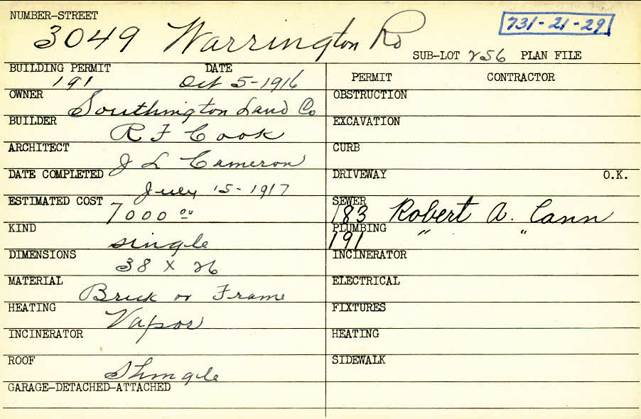3049 Warrington Road Shaker Heights, OH 44120 PARCEL ID: 731-21-029 Building Permit Date: 10-05-1916 Plan File Number: 10406 Microfilm Roll: NewRoll#4 Neighborhood: Onaway Owner: Southington Land Company Builder: Cook, R. F. Architect: Cameron, J. L. Estimated Cost: 7000 Date Completed: 07-15-1917 Kind: Single, Single Residence or Dwelling Material: Brick on Frame Heating: Vapor Roof: Shingles |