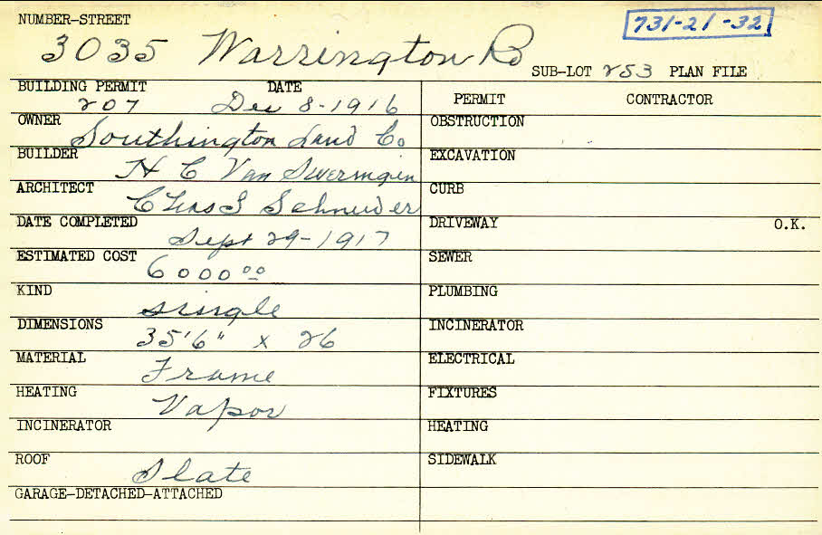 3035 Warrington Road Shaker Heights, OH 44120 PARCEL ID: 731-21-032 Building Permit Date: 12-08-1916 Plan File Number: 0 Neighborhood: Onaway Owner: Southington Land Company Builder: Van Sweringen, H. C. Architect: Schneider, Charles S. Estimated Cost: 6000 Date Completed: 09-29-1917 Kind: Single, Single Residence or Dwelling Material: Frame Heating: Vapor Roof: Slate Card Available: yes |