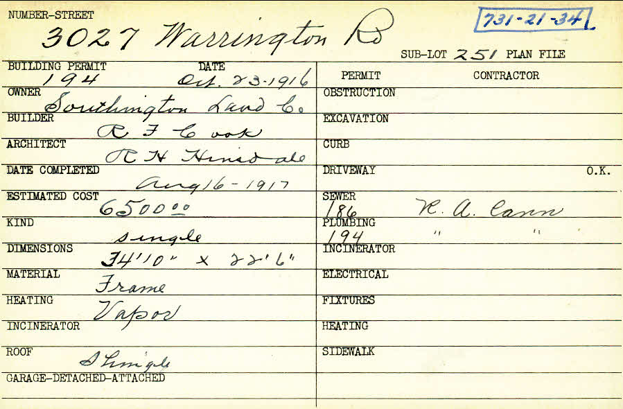 3027 Warrington Road Shaker Heights, OH 44120 PARCEL ID: 731-21-034 Building Permit Date: 10-23-1916 Plan File Number: 0 Neighborhood: Onaway Owner: Southington Land Company Builder: Cook, R. F. Architect: Hinsdale, Reynold H. Estimated Cost: 6500 Date Completed: 08-16-1917 Kind: Single, Single Residence or Dwelling Material: Frame Heating: Vapor Roof: Shingles |