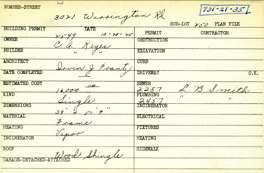 3021 Warrington Road Shaker Heights, OH 44120 PARCEL ID: 731-21-035 Building Permit Date: 10-20-1925 Plan File Number: 0 Neighborhood: Onaway Owner: Keyes, C. A. Builder: Keyes, C. A. Architect: Frantz, Irvin J. Estimated Cost: 16000 Kind: Single, Single Residence or Dwelling Material: Frame Heating: Vapor Roof: Wood Shingle Card Available: yes |