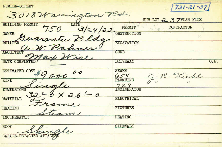 3018 Warrington Road Shaker Heights, OH 44120 PARCEL ID: 731-21-037 Building Permit Date: 03-24-1922 Plan File Number: 3255, 5176 Microfilm Roll: Roll#47, Roll#70 Neighborhood: Onaway Owner: Guarantee Building Builder: Pahner, A. W. Architect: Wise, Max Estimated Cost: 9000 Kind: Single, Single Residence or Dwelling Material: Frame Heating: Steam Roof: Shingles |