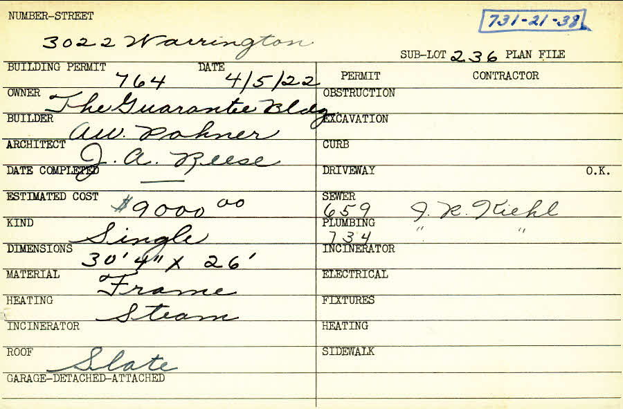 3022 Warrington Road Shaker Heights, OH 44120 PARCEL ID: 731-21-038 Building Permit Date: 04-05-1922 Plan File Number: 0 Neighborhood: Onaway Owner: The Guarantee Building Builder: Pahner, A. W. Architect: Reese, James A. Estimated Cost: 9000 Kind: Single, Single Residence or Dwelling Material: Frame Heating: Steam Roof: Slate |
