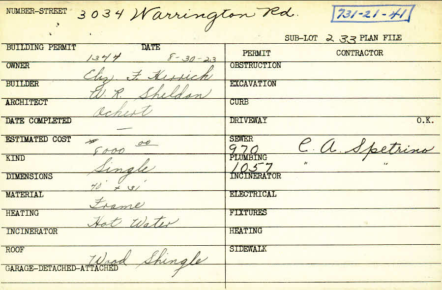 3034 Warrington Road Shaker Heights, OH 44120 PARCEL ID: 731-21-041 Building Permit Date: 08-30-1923 Plan File Number: 4771 Microfilm Roll: Roll#66 Neighborhood: Onaway Owner: Herrick, Elizabeth F. Builder: Sheldon, W. R. Architect: Ockert, Paul Estimated Cost: 8000 Kind: Single, Single Residence or Dwelling Material: Frame Heating: Hot Water Roof: Wood Shingle |