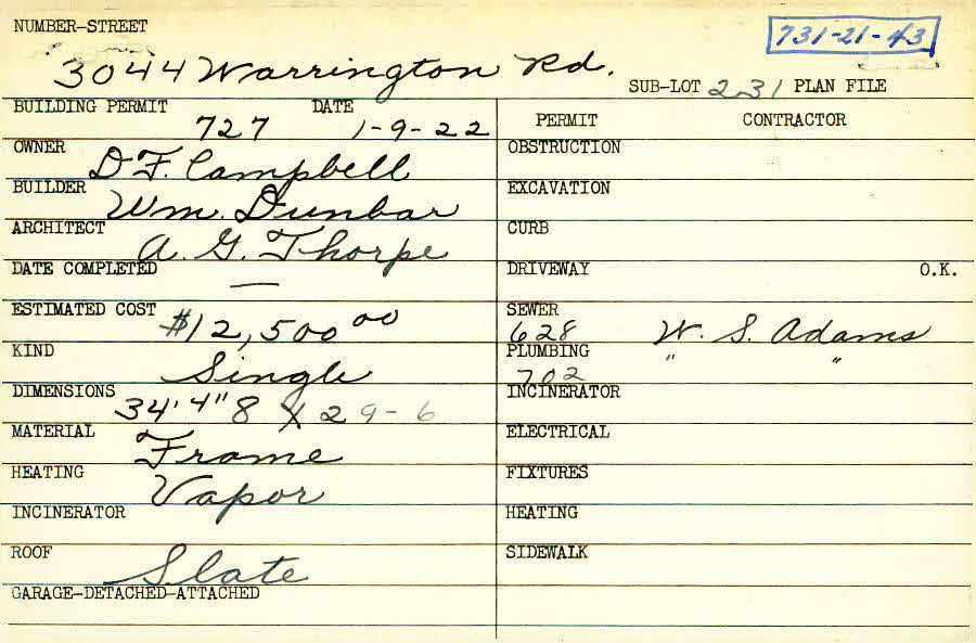 3044 Warrington Road Shaker Heights, OH 44120 PARCEL ID: 731-21-043 Building Permit Date: 01-09-1922 Plan File Number: 5568 Microfilm Roll: Roll#75 Neighborhood: Onaway Owner: Campbell, D. F. Builder: Dunbar, William Architect: Thorpe, A. G. Estimated Cost: 12500 Kind: Single, Single Residence or Dwelling Material: Frame Heating: Vapor Roof: Slate |