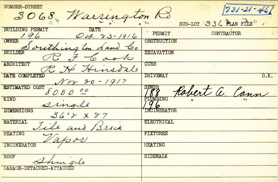 3068 Warrington Road Shaker Heights, OH 44120 PARCEL ID: 731-21-046 Building Permit Date: 10-23-1916 Plan File Number: 0 Neighborhood: Onaway Owner: Southington Land Company Builder: Cook, R. F. Architect: Hinsdale, Reynold H. Estimated Cost: 8000 Date Completed: 11-20-1917 Kind: Single, Single Residence or Dwelling Material: Tile and Brick Heating: Vapor Roof: Shingles |