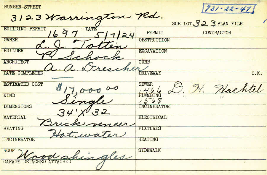 3123 Warrington Road Shaker Heights, OH 44120 PARCEL ID: 731-22-047 Building Permit Date: 05-07-1924 Plan File Number: 7890 Microfilm Roll: Roll#95 Neighborhood: Onaway Owner: Totten, L. J. Builder: Schock, P. Architect: Drescher, A. A. Estimated Cost: 17000 Kind: Single, Single Residence or Dwelling Material: Brick Veneer Heating: Hot Water Roof: Wood Shingle |