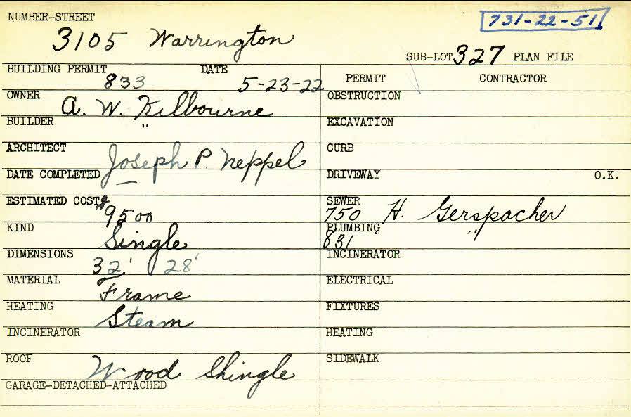 3105 Warrington Road Shaker Heights, OH 44120 PARCEL ID: 731-22-051 Building Permit Date: 05-23-1922 Plan File Number: 472 scanned, 12128 Microfilm Roll: Roll005, NewRoll#11 Neighborhood: Onaway Owner: Kilbourne, A. W. Builder: Kilbourne, A. W. Architect: Neppel, Joseph P. Estimated Cost: 9500 Kind: Single, Single Residence or Dwelling Material: Frame Heating: Steam Roof: Wood Shingle |