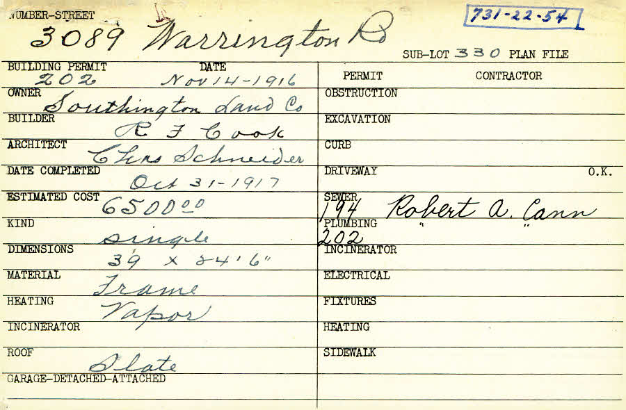 3089 Warrington Road Shaker Heights, OH 44120 PARCEL ID: 731-22-054 Building Permit Date: 11-14-1916 Plan File Number: 1349 all scanned Microfilm Roll: Roll015 Neighborhood: Onaway Owner: Southington Land Company Builder: Cook, R. F. Architect: Schneider, Charles Estimated Cost: 6500 Date Completed: 10-31-1917 Kind: Single, Single Residence or Dwelling Material: Frame Heating: Vapor Roof: Slate |