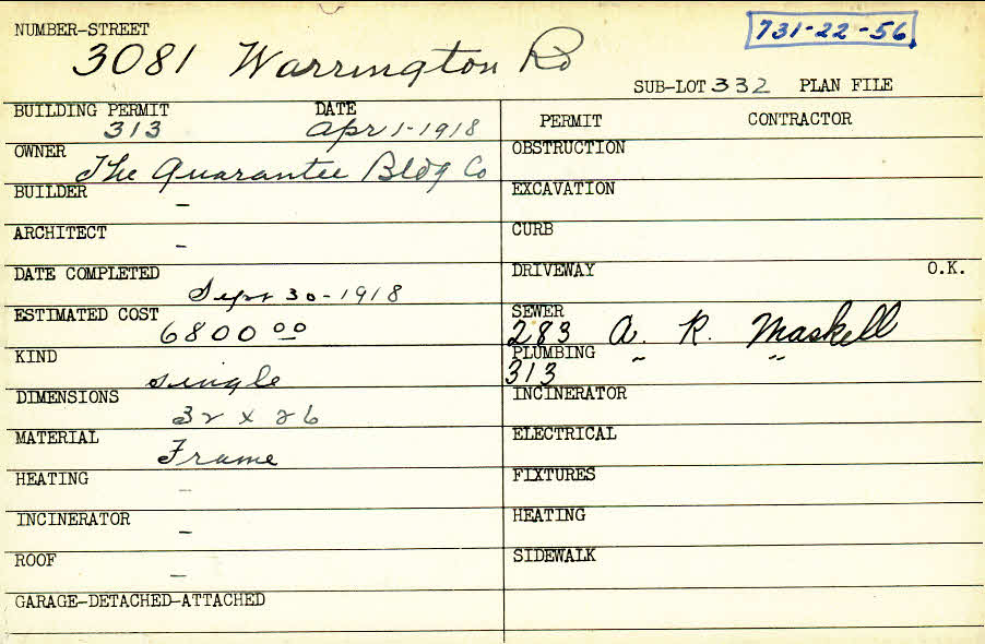 3081 Warrington Road Shaker Heights, OH 44120 PARCEL ID: 731-22-056 Building Permit Date: 04-01-1918 Plan File Number: 7526 Microfilm Roll: Roll#93 Neighborhood: Onaway Owner: The Guarantee Building Company Estimated Cost: 6800 Date Completed: 09-30-1918 Kind: Single, Single Residence or Dwelling Material: Frame |