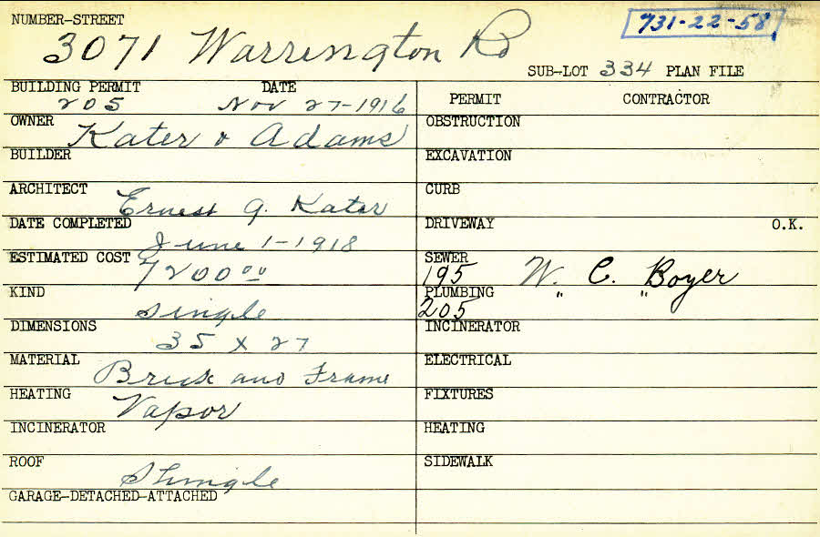 3071 Warrington Road Shaker Heights, OH 44120 PARCEL ID: 731-22-058 Building Permit Date: 11-27-1916 Plan File Number: 4962, 7594 Microfilm Roll: Roll#68, Roll#93 Neighborhood: Onaway Owner: Kater and Adams Architect: Kater, Ernest G. Estimated Cost: 7200 Date Completed: 06-01-1918 Kind: Single, Single Residence or Dwelling Material: Brick and Frame Heating: Vapor Roof: Shingles |