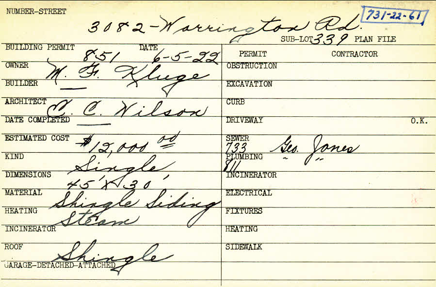 3082 Warrington Road Shaker Heights, OH 44120 PARCEL ID: 731-22-061 Building Permit Date: 06-05-1922 Plan File Number: 4992 Microfilm Roll: Roll#68 Neighborhood: Onaway Owner: Kluge, M. F. Architect: Wilson, E. C. Estimated Cost: 12000 Kind: Single, Single Residence or Dwelling Material: Shingle siding Heating: Steam Roof: Shingles |