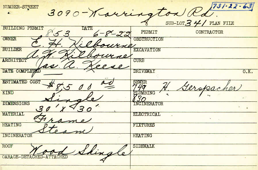 3090 Warrington Road Shaker Heights, OH 44120 PARCEL ID: 731-22-063 Building Permit Date: 06-08-1922 Plan File Number: 0 Neighborhood: Onaway Owner: Kilbourne, E. H. Builder: Kilbourne, A. W. Architect: Keese, James A. Estimated Cost: 8500 Kind: Single, Single Residence or Dwelling Material: Frame Heating: Steam Roof: Wood Shingle Card Available: yes |
