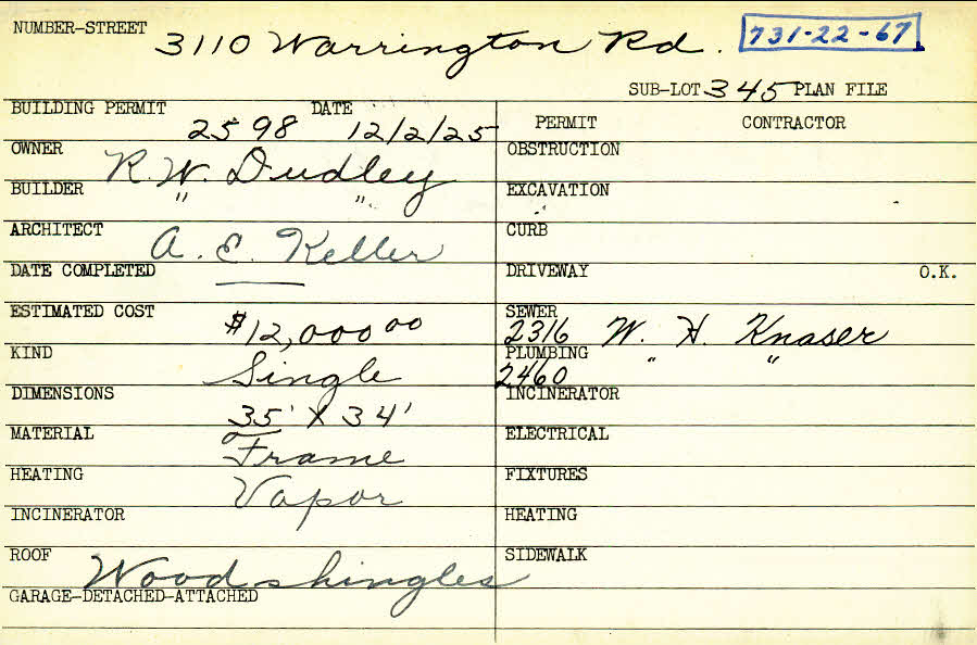 3110 Warrington Road Shaker Heights, OH 44120 PARCEL ID: 731-22-067 Building Permit Date: 12-02-1925 Plan File Number: 0 Neighborhood: Onaway Owner: Dudley, R. W. Builder: Dudley, R. W. Architect: Keller, Arthur Emil Estimated Cost: 12000 Kind: Single, Single Residence or Dwelling Material: Frame Heating: Vapor Roof: Wood Shingle |