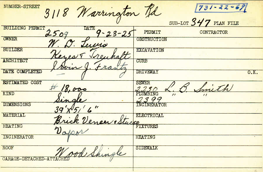 3118 Warrington Road Shaker Heights, OH 44120 PARCEL ID: 731-22-069 Building Permit Date: 09-23-1925 Plan File Number: 0 Neighborhood: Onaway Owner: Lewis, W. D. Builder: Keyes and Treuhaft Architect: Frantz, Irvin J. Estimated Cost: 18000 Kind: Single, Single Residence or Dwelling Material: Brick Veneer and Stucco Heating: Vapor Roof: Wood Shingle Card Available: yes |