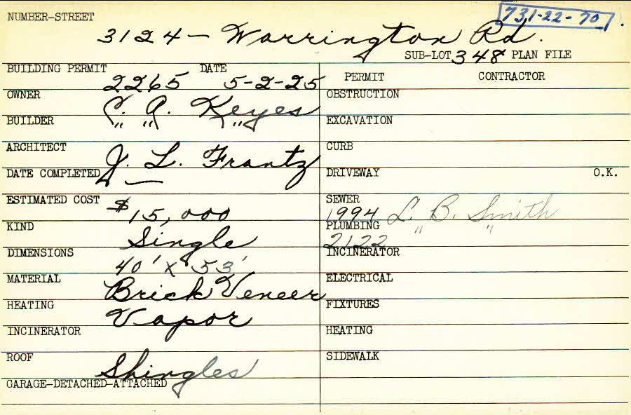 3124 Warrington Road Shaker Heights, OH 44120 PARCEL ID: 731-22-070 Building Permit Date: 05-02-1925 Plan File Number: 0 Neighborhood: Onaway Owner: Keyes, C. A. Builder: Keyes, C. A. Architect: Franz, J. L. Estimated Cost: 15000 Kind: Single, Single Residence or Dwelling Material: Brick Veneer Heating: Vapor Roof: Shingles Card Available: yes |