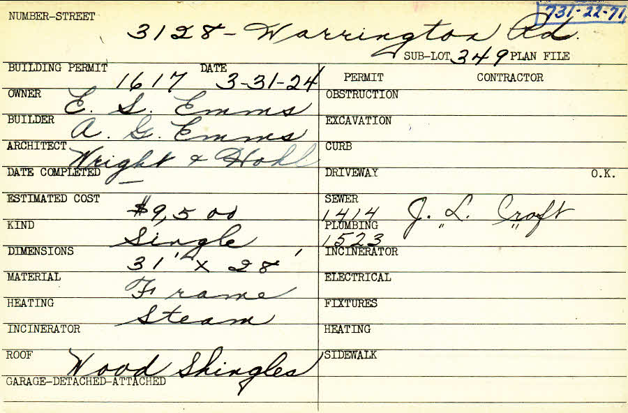 3128 Warrington Road Shaker Heights, OH 44120 PARCEL ID: 731-22-071 Building Permit Date: 03-31-1924 Plan File Number: 2672, 9825 Microfilm Roll: Roll #37, Roll#104 Neighborhood: Onaway Owner: Emms, E. S. Builder: Emms, A. G. Architect: Robert M. Wright and Russell L. Hohl Estimated Cost: 9500 Kind: Single, Single Residence or Dwelling Material: Frame Heating: Steam Roof: Wood Shingle |