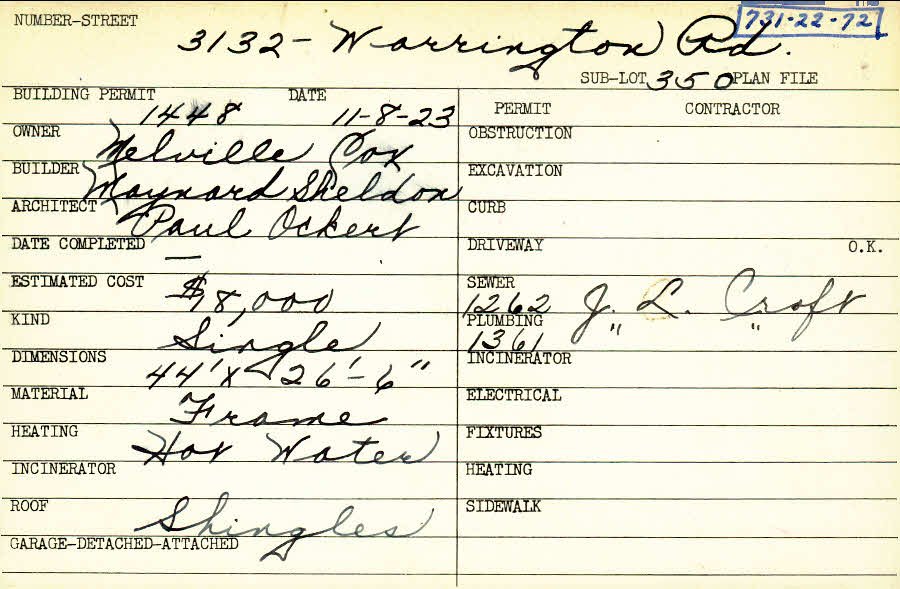 3132 Warrington Road Shaker Heights, OH 44120 PARCEL ID: 731-22-072 Building Permit Date: 11-08-1923 Plan File Number: 11469 Microfilm Roll: NewRoll#7 Neighborhood: Onaway Owner: Cox, Melville Builder: Sheldon, Maynard Architect: Ockert, Paul Estimated Cost: 18000 Kind: Single, Single Residence or Dwelling Material: Frame Heating: Hot Water Roof: Shingles |