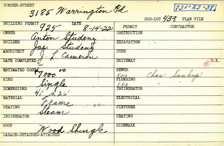 3185 Warrington Road Shaker Heights, OH 44120 PARCEL ID: 731-23-039 Building Permit Date: 08-14-1922 Plan File Number: 10129 Microfilm Roll: NewRoll#2 Neighborhood: Onaway Owner: Studeny, Anton Builder: Studeny, James Architect: Cameron, J. L. Estimated Cost: 7000 Kind: Single, Single Residence or Dwelling Material: Frame Heating: Steam Roof: Wood Shingle |