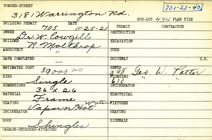 3181 Warrington Road Shaker Heights, OH 44120 PARCEL ID: 731-23-040 Building Permit Date: 11-25-1921 Plan File Number: 0 Neighborhood: Onaway Owner: Cowgill, Dr. W. Builder: Molthrop, R. Architect: Molthrop, R. Estimated Cost: 9000 Kind: Single, Single Residence or Dwelling Material: Frame Heating: Vapor Roof: Shingles Card Available: yes |