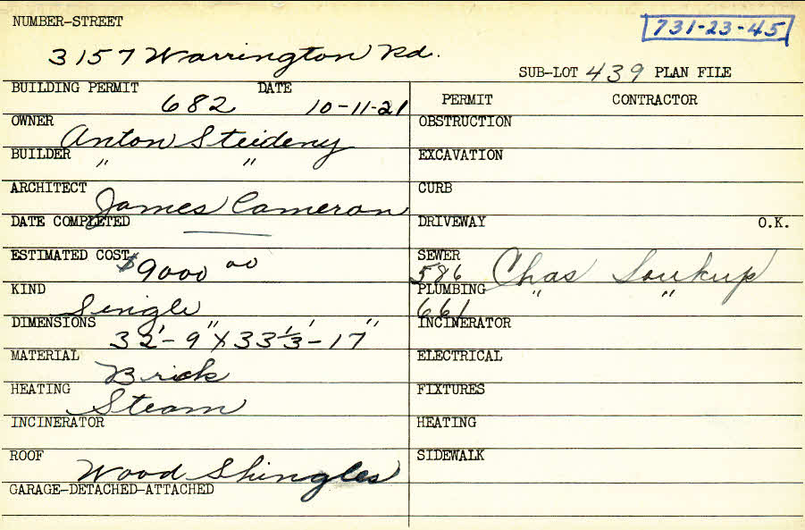 3157 Warrington Road Shaker Heights, OH 44120 PARCEL ID: 731-23-045 Building Permit Date: 10-11-1921 Plan File Number: 0 Neighborhood: Onaway Owner: Studeny, Anton Builder: Studeny, Anton Architect: Cameron, James Estimated Cost: 9000 Kind: Single, Single Residence or Dwelling Material: Brick Heating: Steam Roof: Wood Shingle Card Available: yes |